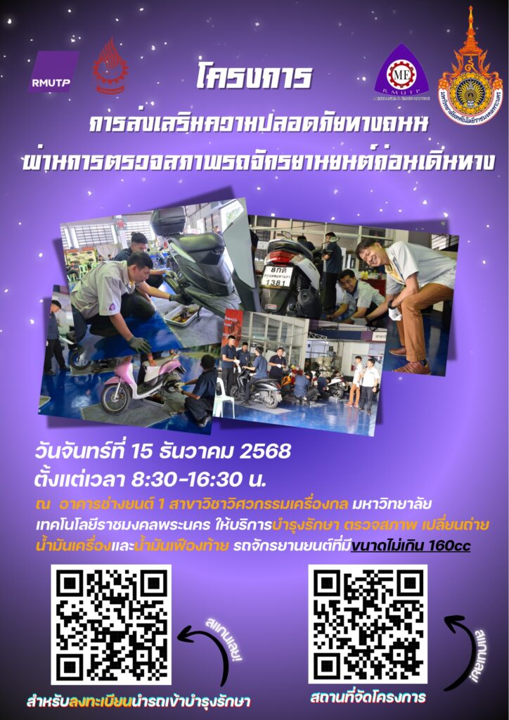 สาขาช่างยนต์ คณะวิศวกรรมศาสตร์ มหาวิทยาลัยเทคโนโลยีราชมงคลพระนคร ขอเชิญชวนนักศึกษา บุคลากร และประชาชนทั่วไป นำรถจักรยานยนต์เข้ารับบริการในโครงการ “การส่งเสริมความปลอดภัยทางถนนผ่านการตรวจสภาพรถจักรยานยนต์ก่อนการเดินทางช่วงเทศกาลปีใหม่ 2569”